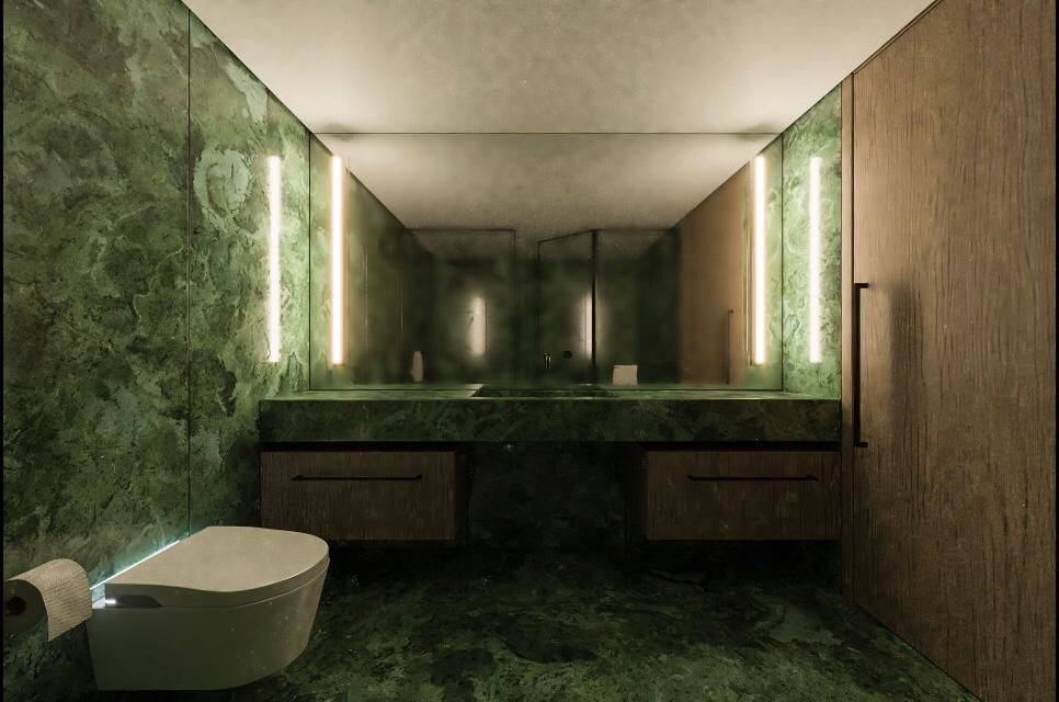 With a tranquil and contemporary aesthetic in mind, the interior design embraces natural smoked oak parquet flooring, sleek stainless steel doors, and an impeccably modern kitchen. Adding a distinctive touch, the owner infused her favorite color, green, embellishing stone surfaces, the kitchen island, and the sink wall with vibrant green quartz. The bathrooms boast exquisite cladding using green Iranian stone, kept exclusively for the owners and discreetly concealed from guests.